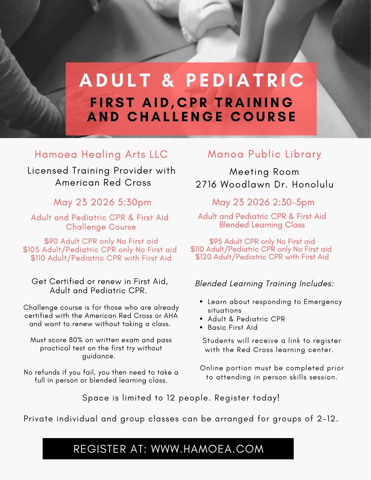 There is a group class Saturday May 23 2026 at the Manoa Public Library from 2:30-5pm or you can arrange a private class or one on one session at your convenience. You must show proof of current Red Cross certification to attend.